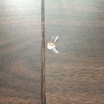 (veneer on ‘solid wood’ cabinet cracked because a framing nail was used instead of a finishing nail and the application is poor)