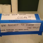 You need protection: gloves, masks…demolishing plaster? ventilating masks!, goggles, and knee pads. You also need to prepare for this. Disconnect all the plumbing, the electrical, the HVAC or radiators. Then, you need to install temporary electrical (we still need to plug in our tools!) and temporary plumbing (we need a toilet!). You need wayfinding (signs that show where the electrical and plumbing are!). You need plywood and plastic to cover any areas of heavy traffic that are being saved (such as a rear patio, front driveway, or built-ins/doors/millwork.)